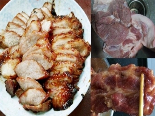 1.購買接近豬頸部位的梅頭肉1斤切開三片儘量薄些,加適量料酒醃半小時後加入叉燒醬3勺約20克