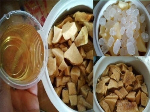 切好後放在在乾淨的容器裡,一般用玻璃瓶或陶瓷容器好些,一層蘋果一層冰糖,