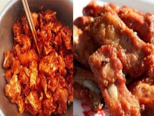 3、熱鍋倒油,油多倒一點;油燒製冒青煙泡泡變小就可以放入排骨油炸;炸至肉變色,撈出控油待著复炸;油涼涼後用鍋鏟剷出油裡的渣滓(因為放了澱粉,所以渣滓會很多,但是放澱粉會鎖水,排骨會酥而不干,所以用漏勺撈出渣滓就行),再次燒熱油,直到泡沫全消倒入排骨,翻幾下趕緊撈出(這一次油溫要比第一次炸更高一點,速度要快,排骨下鍋不到一分鐘就撈起,防止炸焦)。