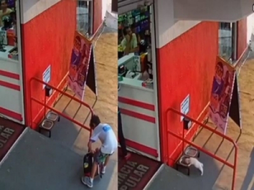原來他將小狗狗連同書包,一起帶到當地一間藥局門口,小心翼翼地將小狗狗從書包裡抱出來,放到藥局門口的「乾糧區」。