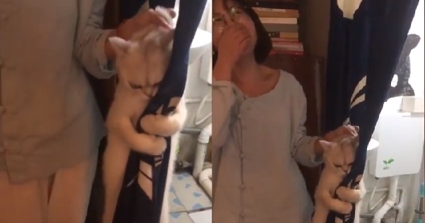 小貓咪緊抓著門簾,表情非常厭世,而且死都不放手阿~