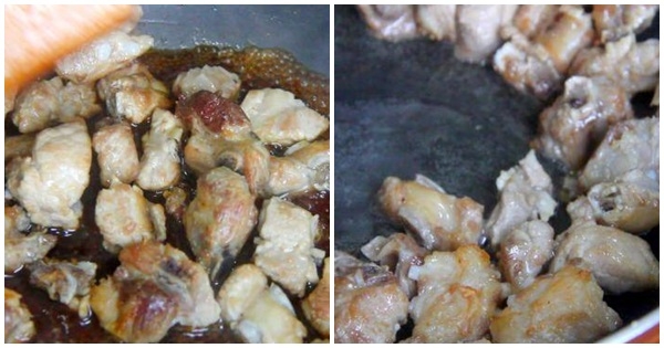 5.往另一個鍋中放入煸炒好的排骨後倒入先前調好的味汁直到湯汁沒過排骨就好