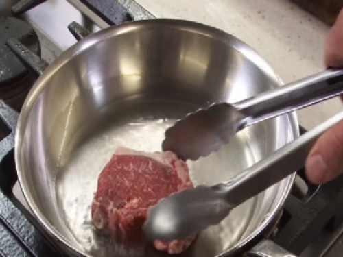 隔天,進行對比實驗,最重要的就是要將牛排煎到一樣的熟度,他們將冷凍與冷藏牛排一起下油鍋煎,並將牛排兩面都各煎上90秒。