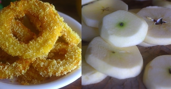 6、將蘋果圈放在麵包糠中,進行充分的蘸取。