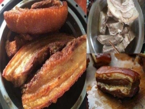 接下來這一步很重要,就是豬肉炸起來後用一個盤裝點水把肉放盤上,豬皮朝下,盤上面的水可以沒過豬皮就可以了,待豬皮浸泡三五分鐘,這部忘記拍圖了。