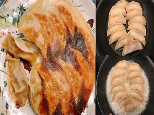 將鍋翻轉,煎餃便會脆皮朝上落在盤中。