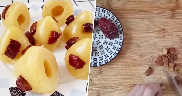 分成小塊將小麵團搓圓,再用大拇指戳入麵團中間,旋轉窩頭成錐形,然後把紅棗塊按在窩頭上。