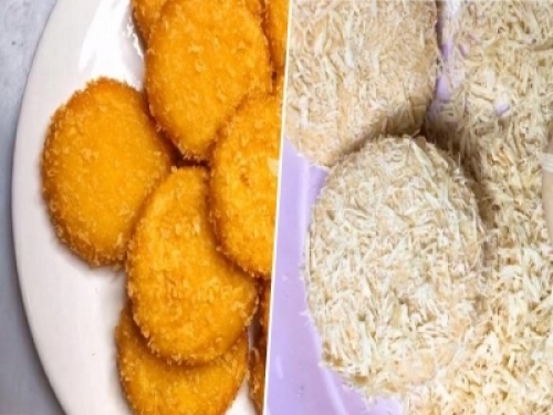 第七步:麵包糠倒在盆中,把沾過牛奶的糯米餅再放進麵包糠中,再次裹上一層麵包糠,按照這樣的順序把全部小餅都做好。