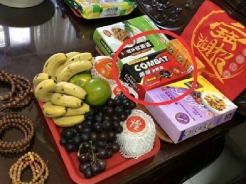 網友說假日回家時看到家裡正好在拜拜,不過仔細一看總覺得哪裡怪怪的,只看桌上放了滿滿一桌的零食,不過總覺得有一盒零食看起來很顯眼!一看那個竟然是「滅蟑螂」的藥!馬上跟阿嬤說這個不能拜啦,這個是要消滅蟑螂的,網友們看了也笑翻說:可能拜過後效果會更好XD