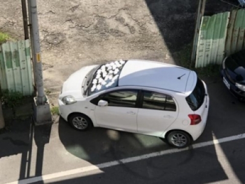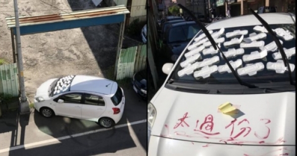 只見這輛白色轎車不知道是趕時間還是怎樣,車子就這樣隨便停在路邊,雖然是白線沒有錯,不過這個位置剛好是人家停車場的出口!害的人家停車場的車子都沒辦法出來,最後被人報復整個擋風玻璃上貼滿了衛生棉,車蓋上還被人用紅色的字體寫上「太過分了!」