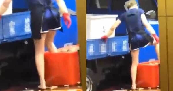 影片中只見這名女店員穿著拖鞋把腳伸到裝滿水的塑膠桶裡面,不斷踩來踩去再清洗裡面的生薑,有時候還會因為女店員動作太大讓生薑掉在外面,但女店員絲毫不緊張又把生薑拿起來繼續丟進塑膠桶裡面繼續清洗!