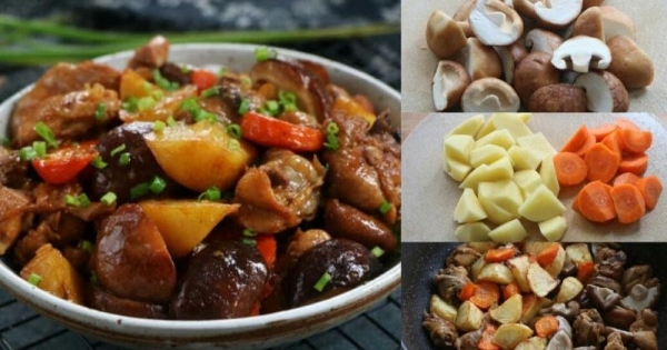 6、直到鍋里還省下一半的湯汁,倒入香菇、土豆、胡蘿蔔繼續燉至熟爛;