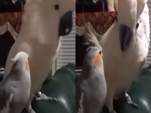 遇到喜歡的異性,我們都會想要展示自己最好的一面,給對方留下好印象,人會這樣,動物也會想盡辦法撩妹的,這隻可愛的白鸚鵡和灰鸚鵡在客廳,一看到有妹子,趕緊上前搭訕,卻意外的「落漆」啦~~~