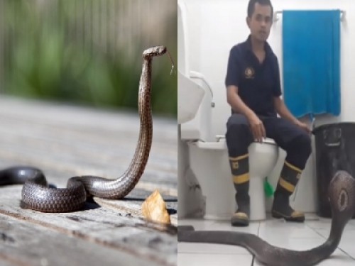▲這位曼谷消防員頌傑(Somjet Kondabya)本身是一位抓蛇高手,所以他在臉書上PO出一段影片,影片裡事他與一隻眼鏡蛇在廁所相遇,該怎麼辦。(圖/翻拍自東森新聞)