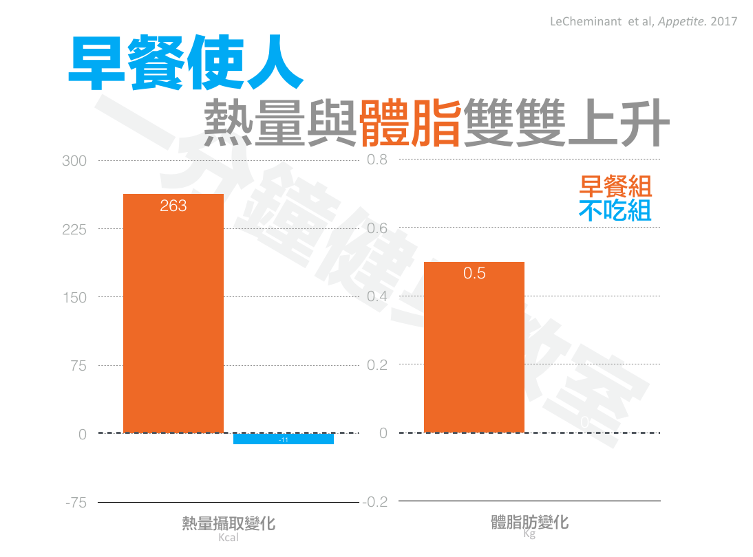 在一個月的時間裡,早餐組比不吃組每天多攝取了266大卡,這些熱量也反映在體重上:她們比不吃早餐的同胞多增加了0.7公斤體重,這些重量完全來自脂肪。