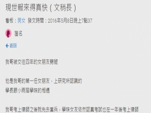 於是小王終於知道我哥的存在了,但是小王反而Po文指責我哥是第三者介入他們