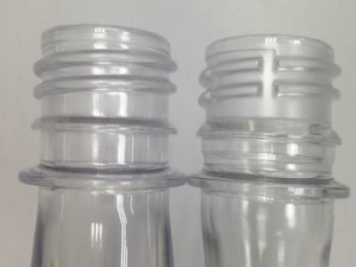 具體講左邊是 1881 熱充瓶口,右邊是 1881 無菌瓶口,分別用於熱灌裝飲料、冷灌裝飲料。熱充瓶口除了螺紋沒有缺口外,瓶口內徑尺寸小一點,瓶口壁厚要厚一點,當然還有一些其他的小小的不同點。