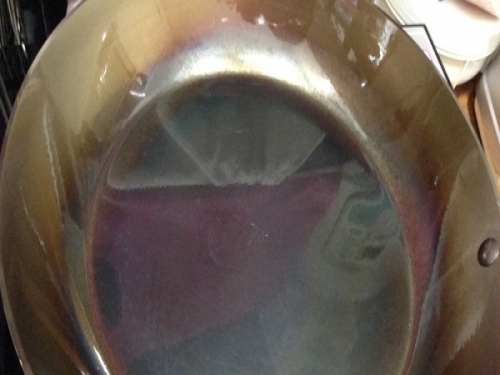 先把新買的鍋放在大火上乾燒。可以看到鍋內顏色有變換。