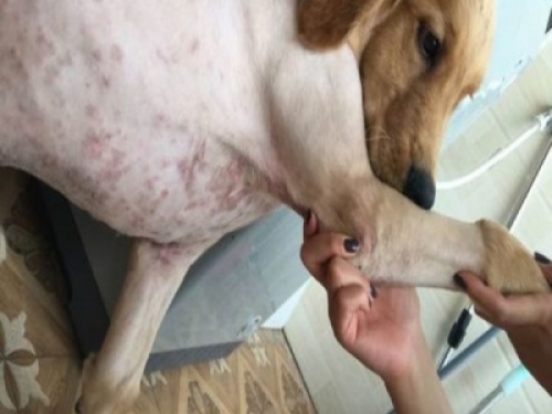 我家黃金獵犬樂樂是去年十一國慶節我回家的時候在路邊撿到的。當時我就看見一團髒乎乎的毛鬆鬆的東西在路邊的垃圾箱徘徊,正好我手里有點吃的東西,我就隨手給它扔了過去,可沒想到小家夥不僅吃了,還跟上我了,一開始我還不讓它跟著我,可是它也沒放棄,就一直跟著,我看著它可憐,就把它帶回了家。我就在農村,有個自己的小院,我就在院子里給它用水簡單的洗了洗,然後就帶到我們村的獸醫王叔家,王叔說狗身上有皮膚病,其他沒啥事,就幫我把狗身上的毛全剃了,這一剃才發現,原來有這麼嚴重的皮膚病啊!